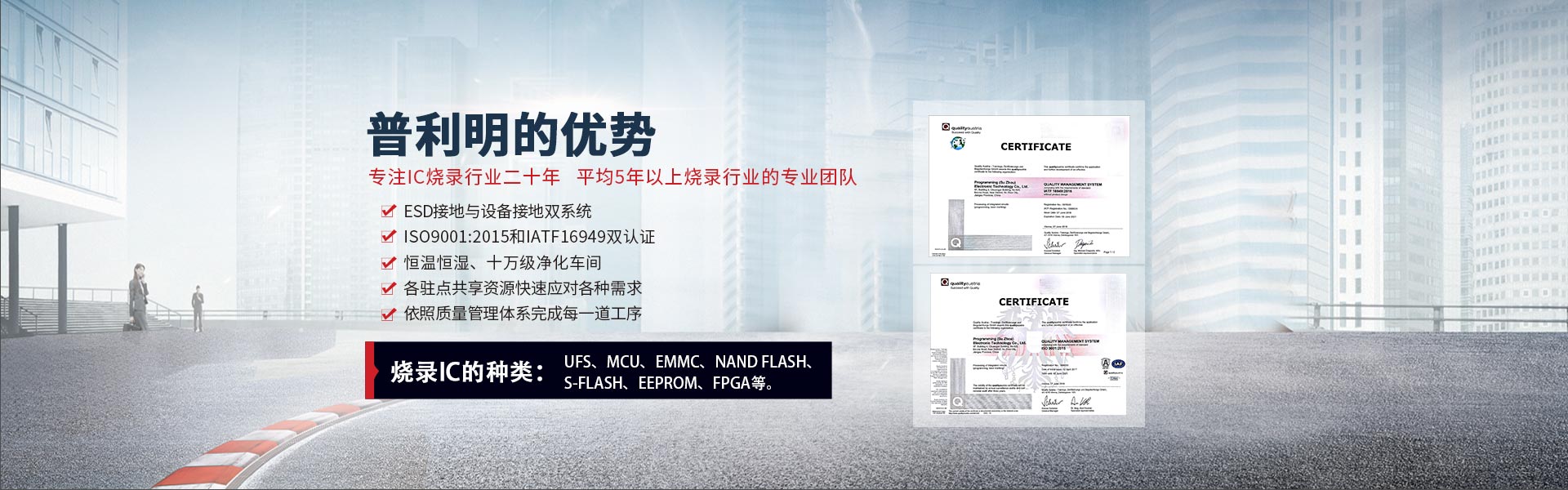 普利明公司成立于2002年,深耕芯片烧录和测试行业20余载,拥有技术过硬的管理团队,生产车间具备恒温恒湿的万级净化条件、独立的ESD监控、多品牌手动、自动化烧录测试设备、安全的客户数据管理系统、高品质的生产流程,并通过了ISO9001和IATF16949汽车行业双体系认证!